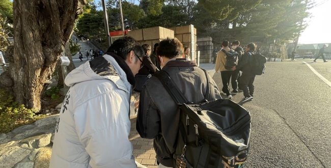 次々に到着するタクシーやバスを降りた受験生が、受験票を大学職員に見せると、あわてて坂を…