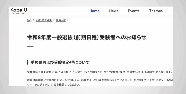神戸大は、公式サイトに「令和8年度一般選抜(前期日程)受験者へのお知らせ」を掲載してい…