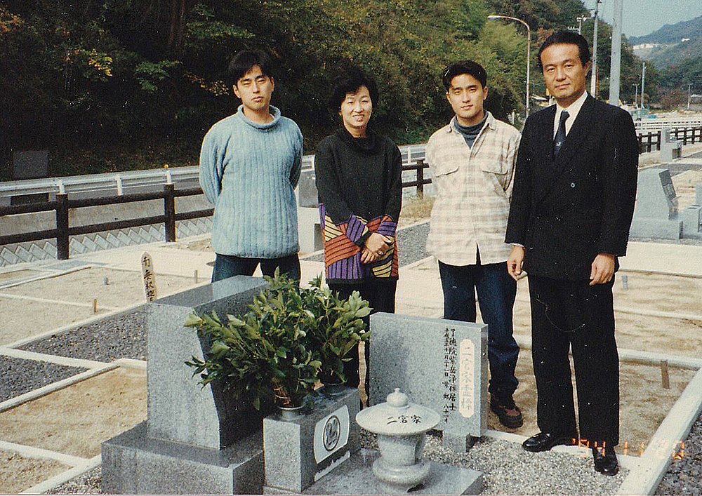 《写真》祖父の法要のあと、松山のお墓の前で 左端が健太郎さん(1994年11月20日)