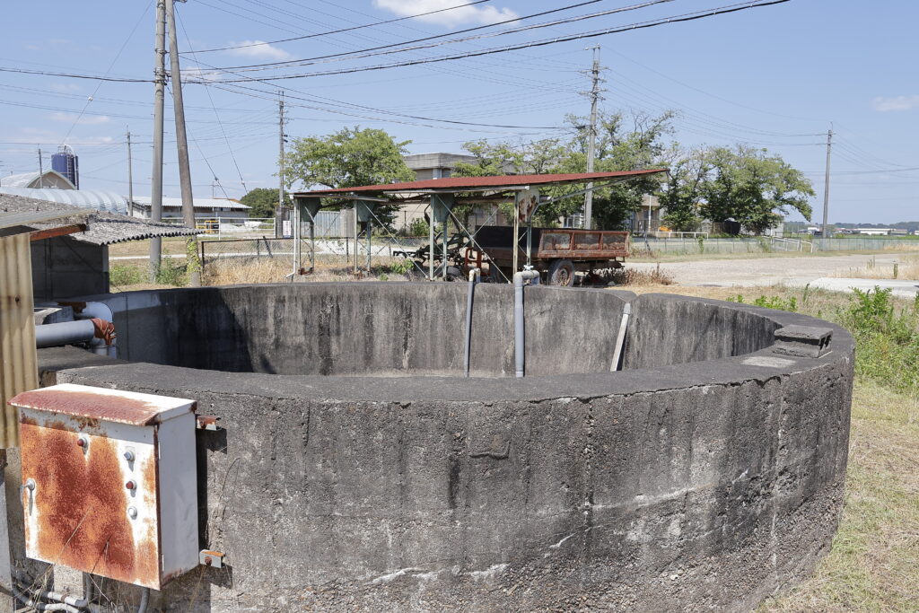 農舎棟の近くにも円形貯水槽がある。地図中15番の円形貯水槽は土で埋まっていたが、この円形貯水槽は、今もセンターで稲の苗の育苗などに利用されている。