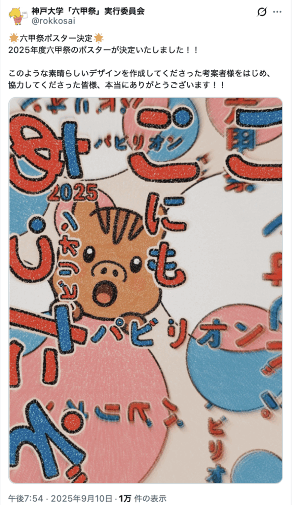 9月10日19時54分、六甲祭実行委員会はX(旧ツイッター @rokkosai)で、「2025年度六甲祭のポスターが決定いたしました」と発表した。<編集部>