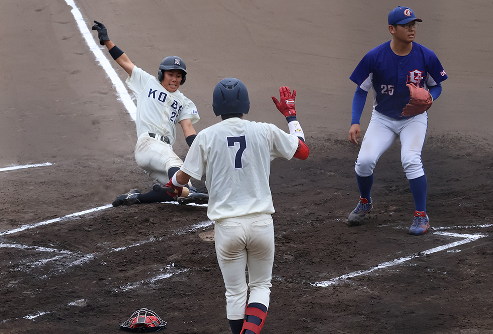 (写真:6回表、相手の守備の乱れに乗じ森岡が生還し、神戸大は1点を返した 2025年10月3日 13時50分 堺市中区の「くら寿司スタジアム堺」で)