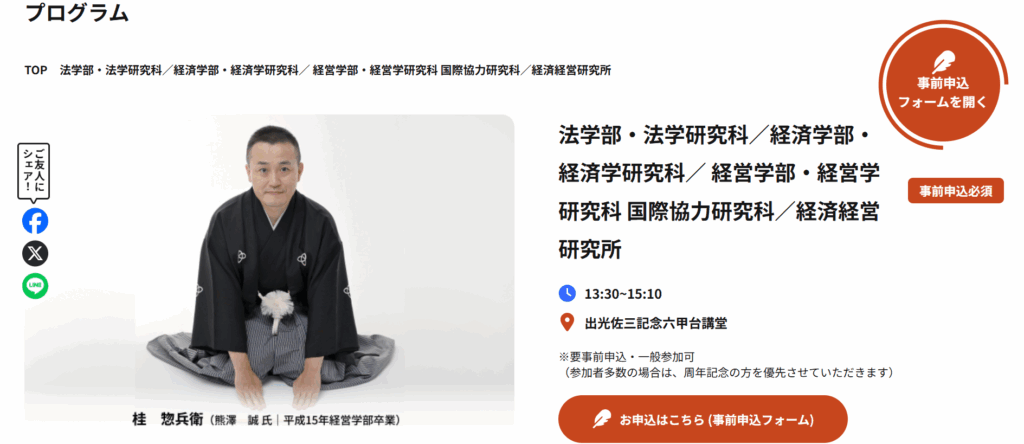 ●申込フォーム=https://docs.google.com/forms/d/e/1FAIpQLSdMpbxQjnL2Mhr3l-tv4y6JrDSdAWEjj0_aAgwIXDwUK1eciA/viewform(学部企画に「参加する」を選択後、参加希望の学部として「法学部・研究科、 経済学部・研究科、経営学部・研究科、国際協力研究科、経済経営研究所」を選択)