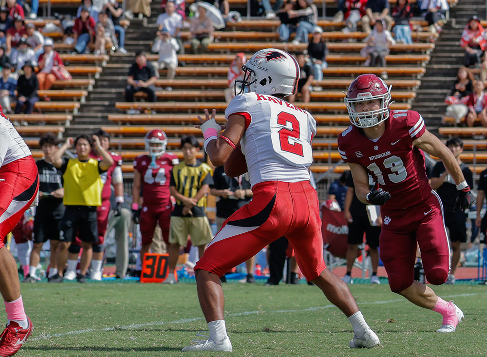 (写真:インターセプトから、立命に30ヤード以上を走られタッチダウンを許す 久保田一輝 撮影)