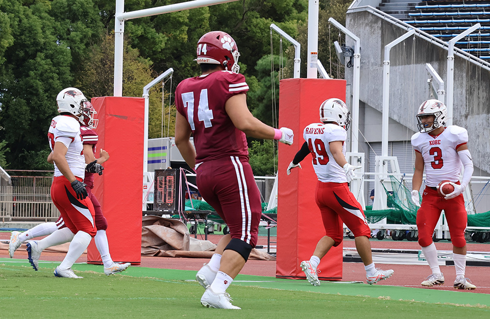 ハーフタイムを挟んだ第3Q、ようやく神戸大にもタッチダウンが生まれた。パントブロックから、ディフェンスのいないフィールドをDB佐々木翔太#3が走り抜け、タッチダウンを決めた(6-24)。ポイントアフタータッチダウン(PAT)はキックを選択し、K下村慎#26がしっかりと決めた(7-24)。