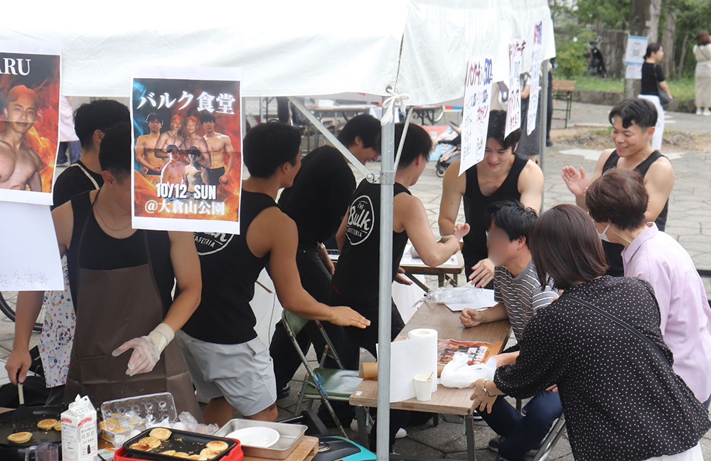 模擬店の中でも特に異彩を放っていたのは、筋肉質の男性有志が出店した「バルク食堂」だ。プロテインドリンクやパンケーキを販売する模擬店だが、懸垂にチャレンジしてその回数に応じて値引きが受けられるといった風変わりなシステムを導入していたほか、パンケーキを購入した場合には模擬店スタッフと一緒に「筋肉ダンス」を踊れるサービスも展開し、会場を訪れた人々の注目をたびたび集めた。スタッフは「みんなにタンパク質と勇気を届けたいという思いでやっている。売上とかどうでもいいです」と冗談交じりに話した。