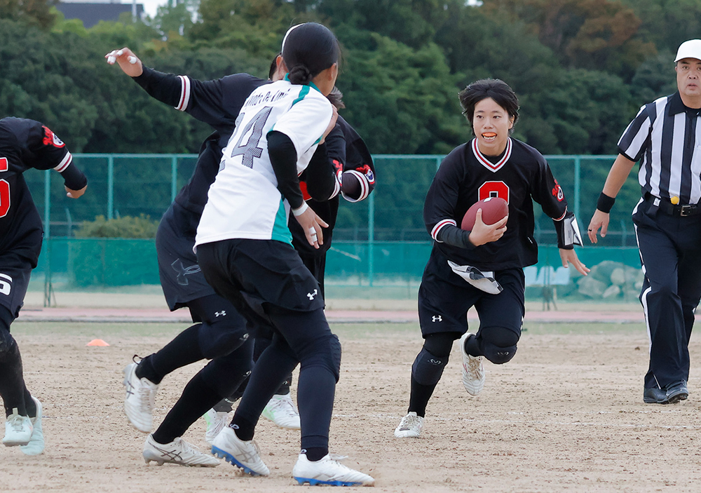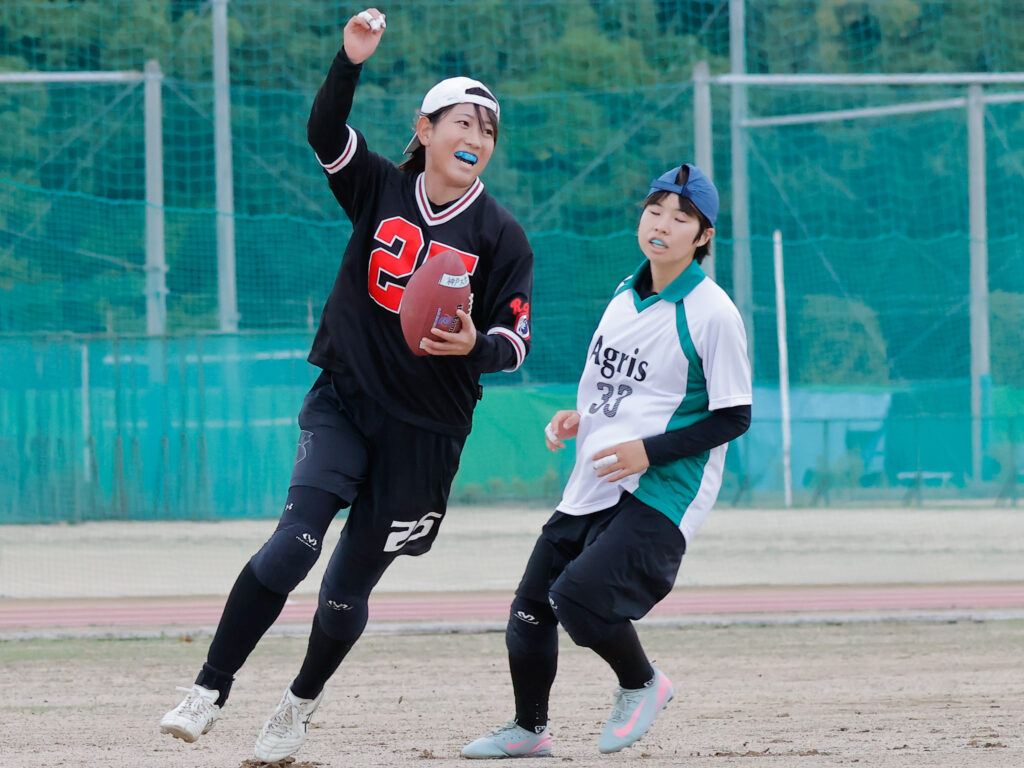 西宮市の武庫川女子大学総合グラウンドで行われた、2025年度関西学生女子タッチフットボール秋季リーグの第2戦。少し肌寒い浜風が吹く中、神戸大の第2戦は始まった。