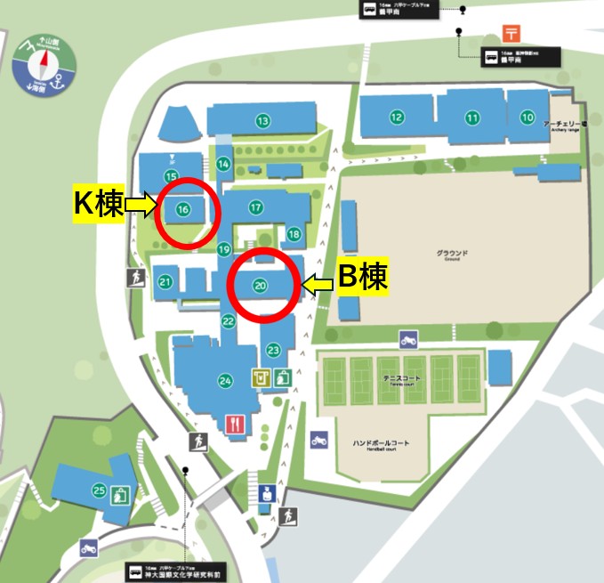 (写真下:奨学金関係や課外活動関連など多くの学生窓口が移転してくる予定のK棟/鶴甲第1キャンパスのマップ)