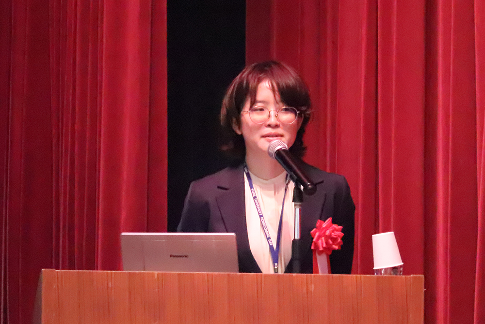 (写真:「人間とウェアラブルコンピュータの共進化」をテーマに講演する、工学研究科准教授の大西鮎実さん。2025年10月25日10時51分、六甲台講堂で)