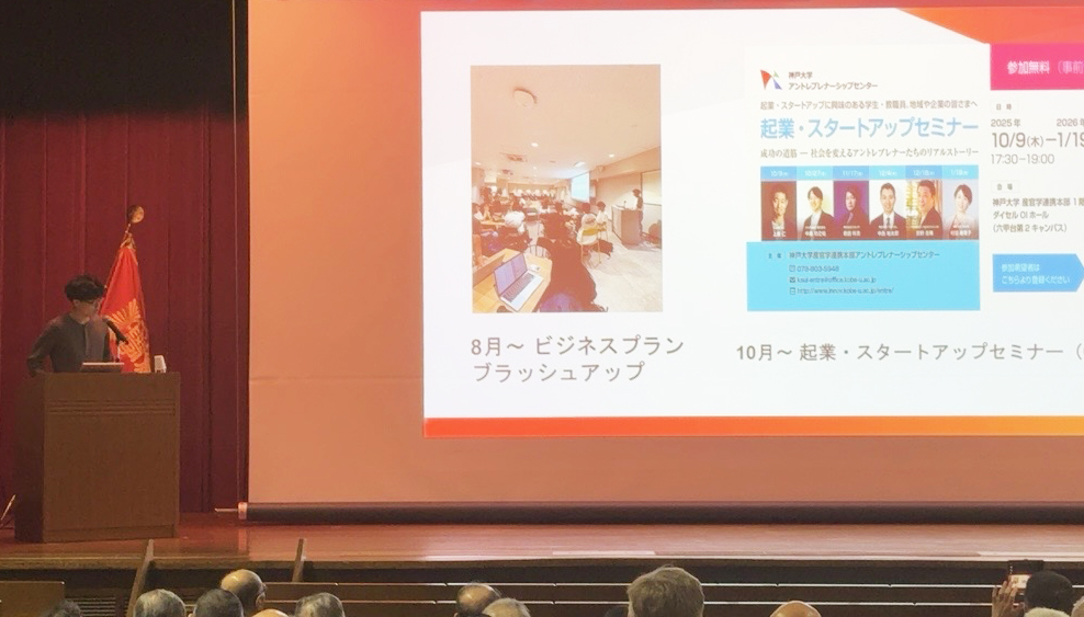 (写真:起業部による活動報告の様子。2025年10月25日11時31分、六甲台講堂で)