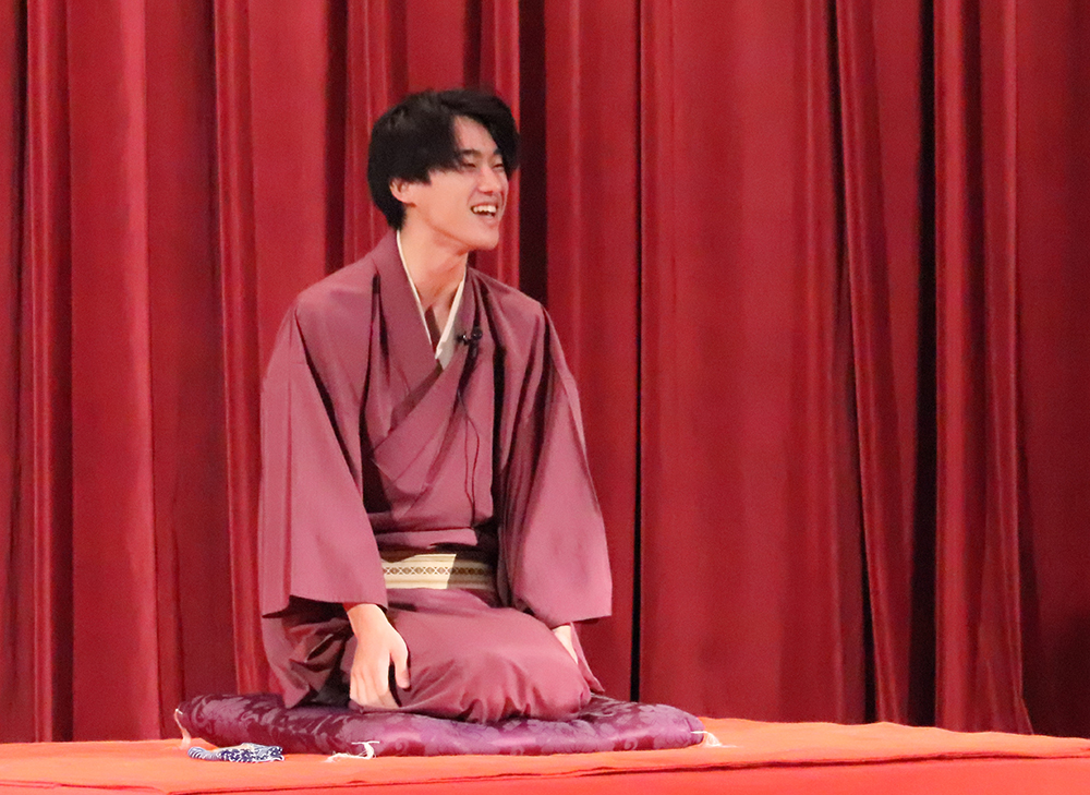 続いて、第59代会長を務めた可愛家のれんさん(国人4年)も舞台に上がり、実家を締め出された男女の話「宮戸川」を披露。登場人物の巧みな演じ分けで会場を盛り上げ、オチで笑いを引き出した。