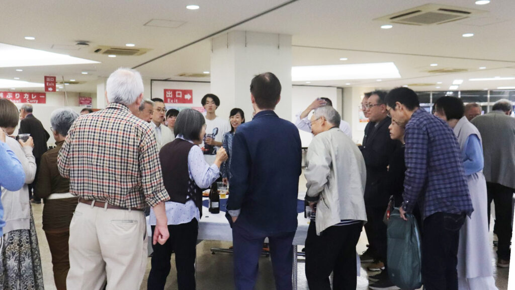 落語会終了後はアカデミア館1階のBEL BOXカフェテリアで落語研究会の懇親会が現役部員も交えて開かれ、OB・OGらは学生時代を懐かしみながら談笑を楽しんだ。