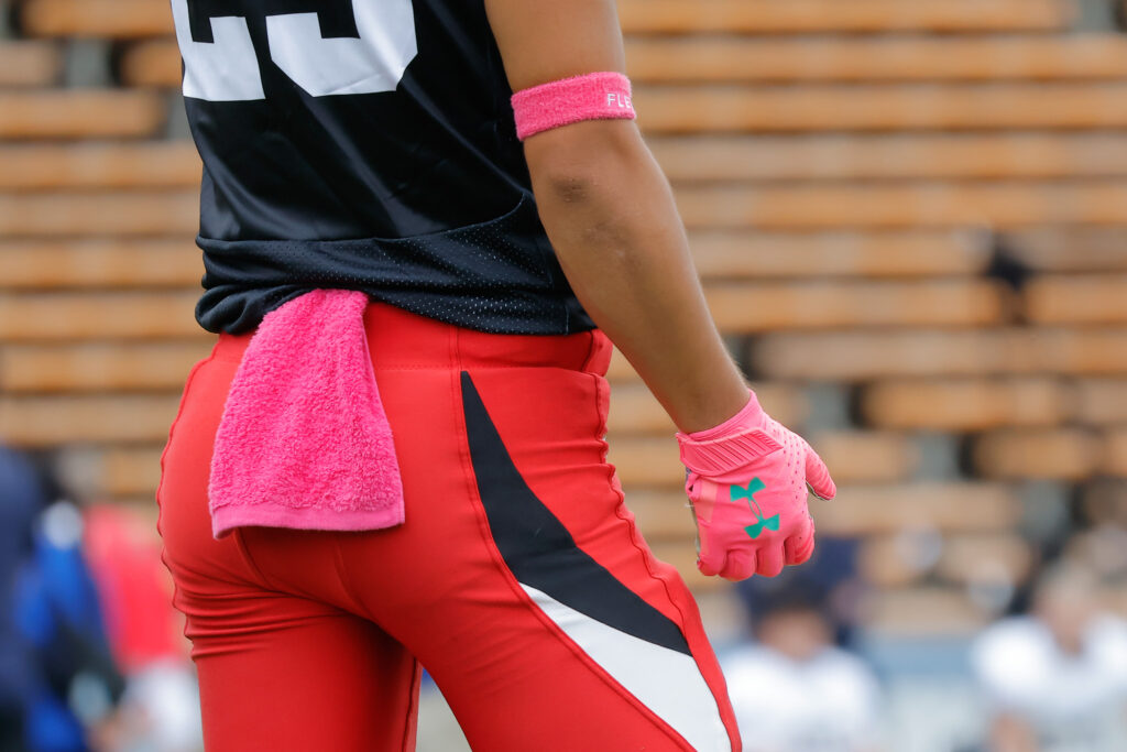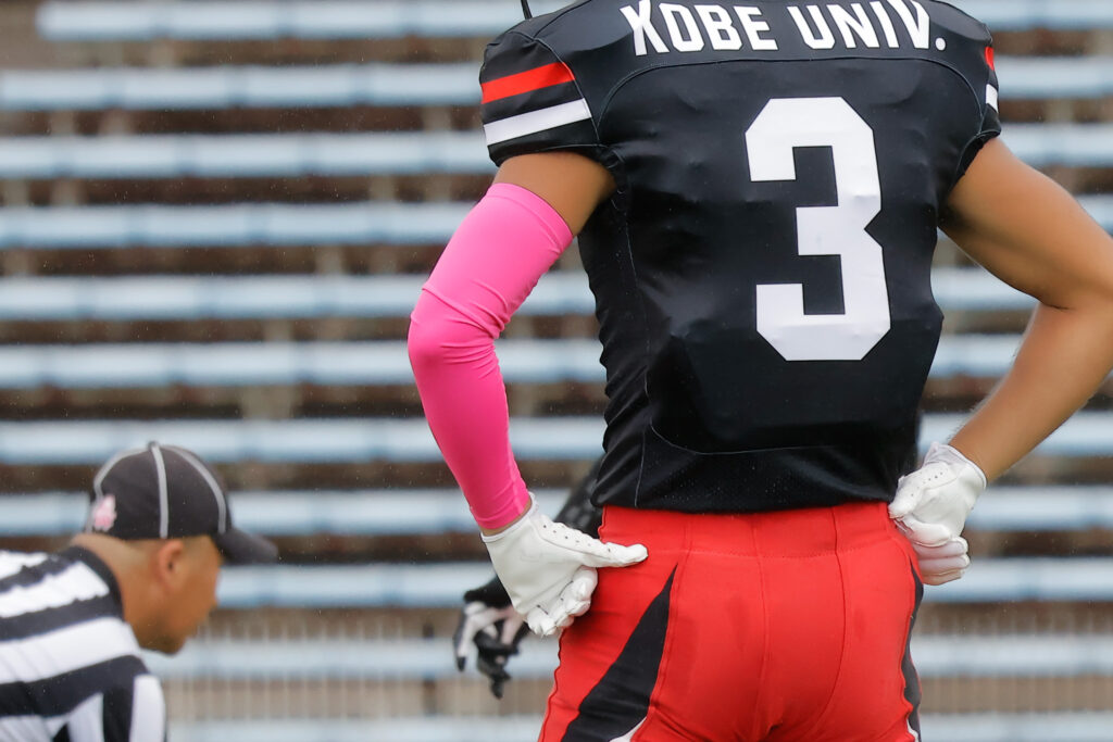 (写真:関学大戦でピンクのアームカバーを身に着けた選手 10月26日 たけびしスタジアム京都で撮影)