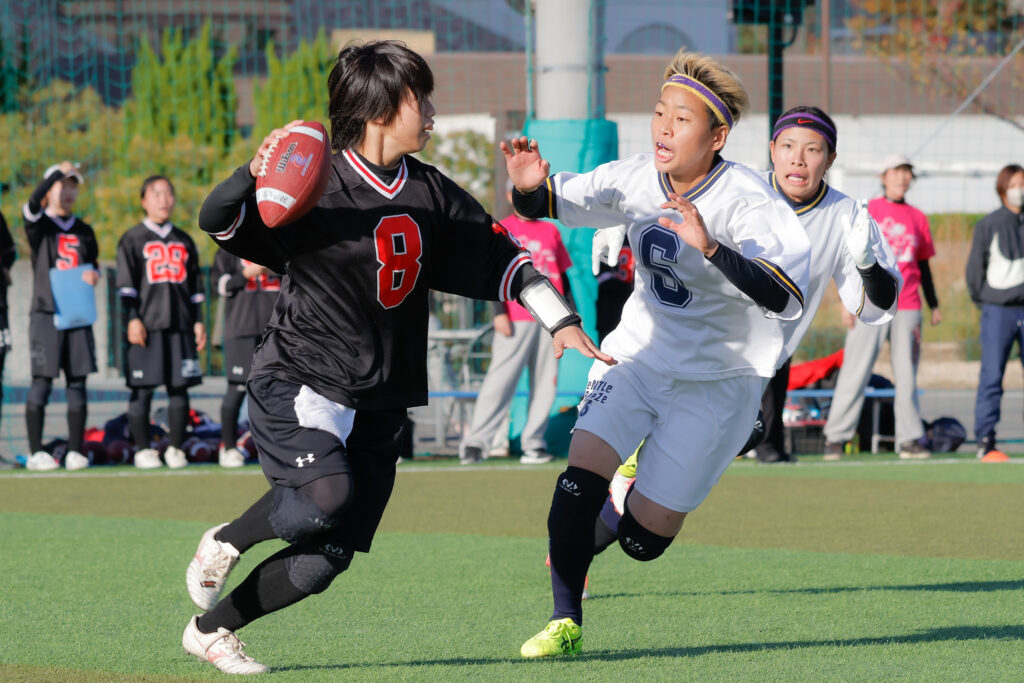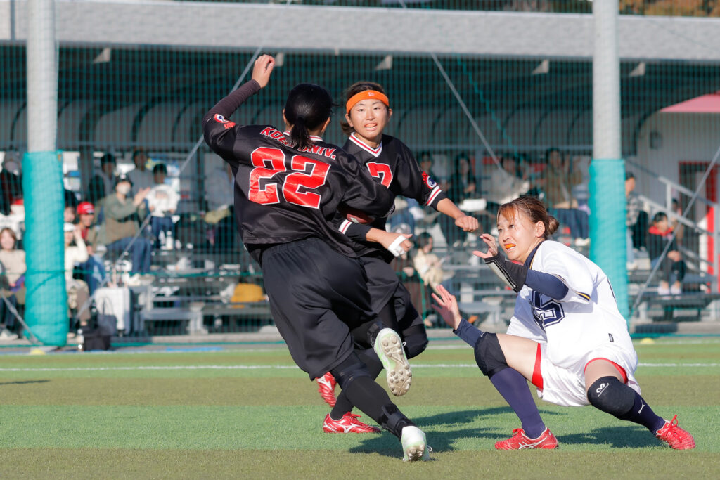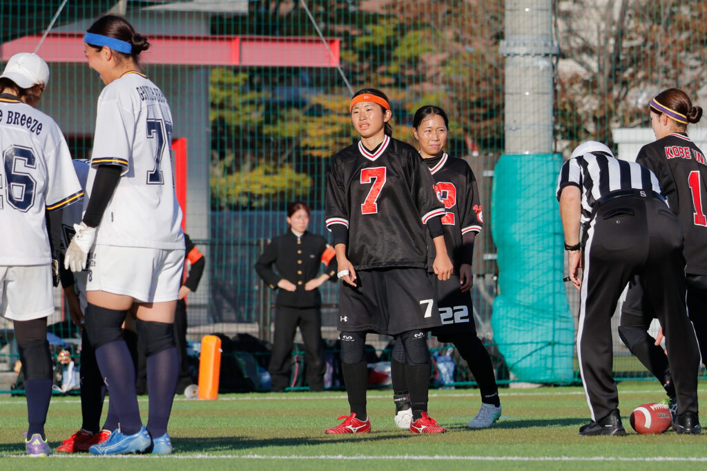 第2Q、武庫女大は再びゴールラインに迫るもDB三川穂乃佳#25が阻止。一方の神戸大は、武庫女大ディフェンス陣からのハイプレッシャーやキャッチミスが続き、攻め手を欠いた。