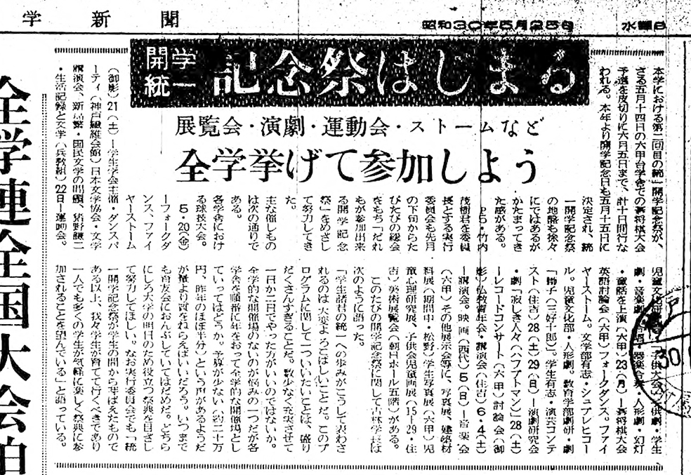 1955年(昭和30年)5月25日付の『神戸大学新聞』には、「開学統一記念祭はじまる」という見出しが出ています。「第二回目の統一開学統一記念祭が、さる五月十四月の六甲台学舎での碁将棋大会予選を皮切りに六月五日まで、計十日間行なわれる」「本年より開学記念日も五月十五日に決定され、統一開学配念祭の地盤も徐々にではあるが、かたまってきた感がある」と書かれています。