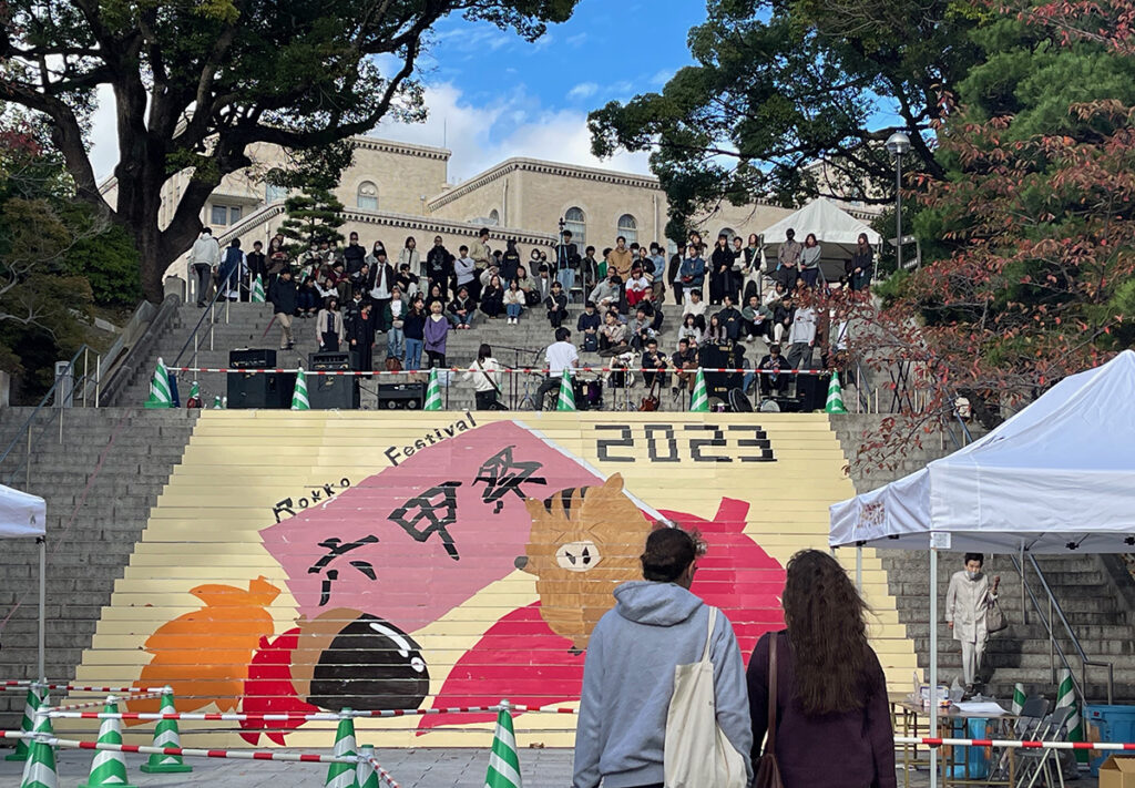 (写真:「六甲祭」の装飾が行われる六甲台正門の大階段 2023年11月11日撮影)