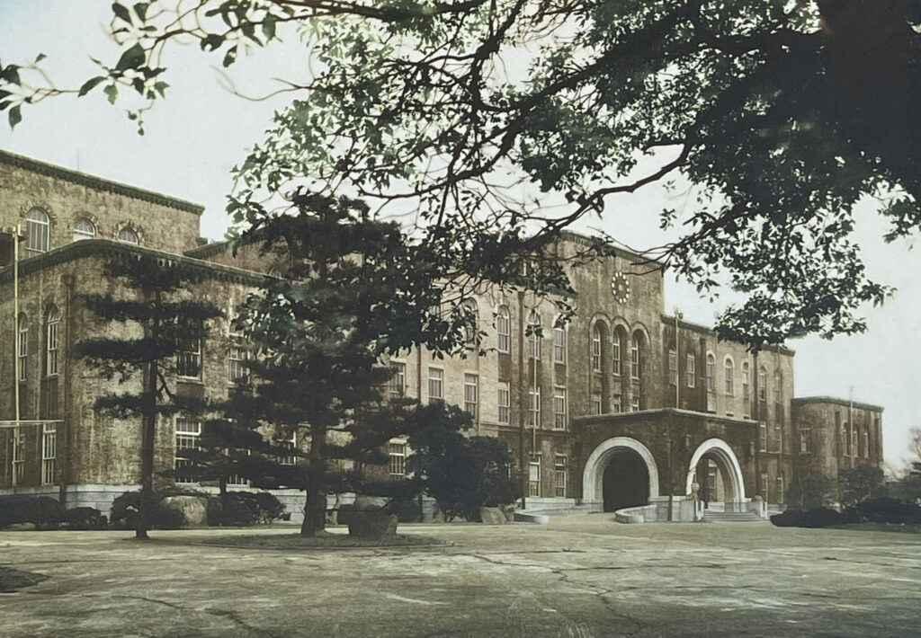 経済学部の第2回卒業記念アルバムの扉には、カラー写真の六甲台本館が掲載されています。昭和20年代後半に撮影された写真と思われますが、まだ壁面には戦時迷彩の黒い跡が残る姿です。