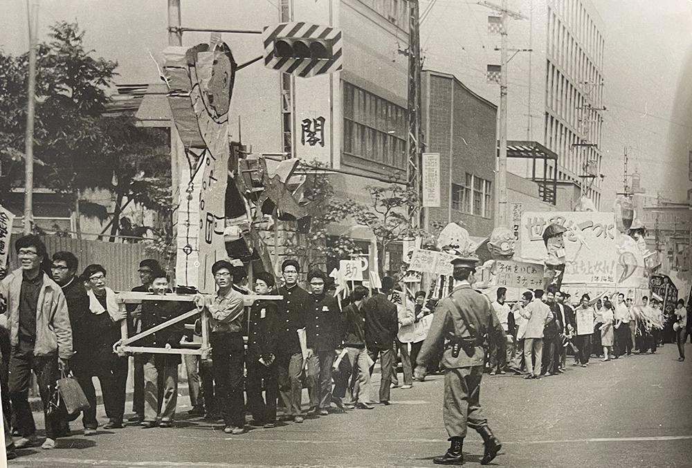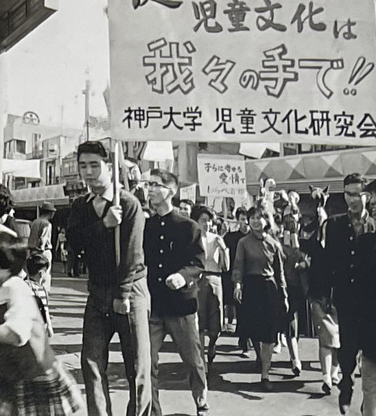<画像:1965年の卒業アルバムに掲載された市中パレード 児童文化研究会が「スローガン」を掲げている>
