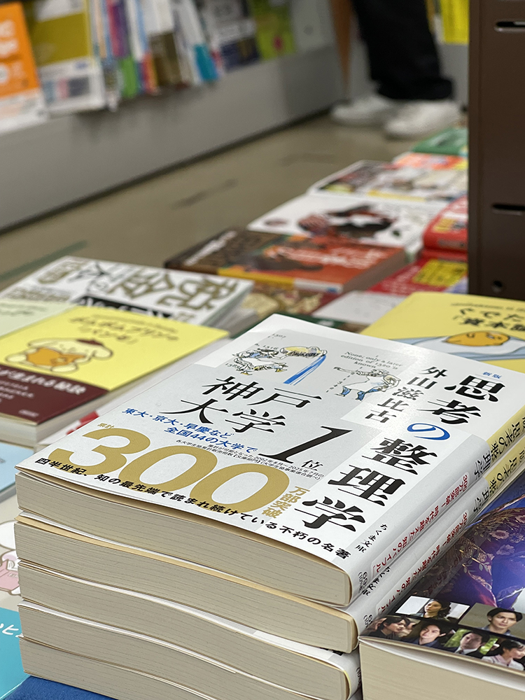 帯には「神戸大学1位」と大きく表示。「全国44の大学で1位」「300万部突破」「四半世紀、知の最先端で読まれ続けている」と、静かな書籍コーナーの中で勢いのあるコピーが目立っている。