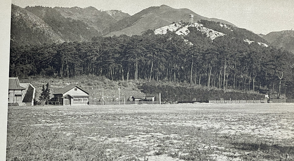 (写真C:「グラウンド」というタイトルのついた写真。現在の六甲台グラウンドと思われる。左端に「武道場」が見える。その右=東側=に写真Aの弓道場があることがわかる いずれも昭和13年の卒業アルバムから)