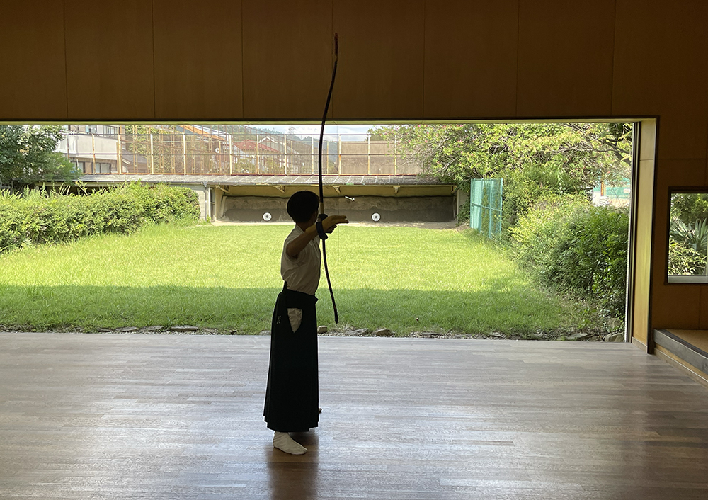 現在の弓道場を訪ねると、静かなたたずまいの中で、弓を引く部員の姿があった。