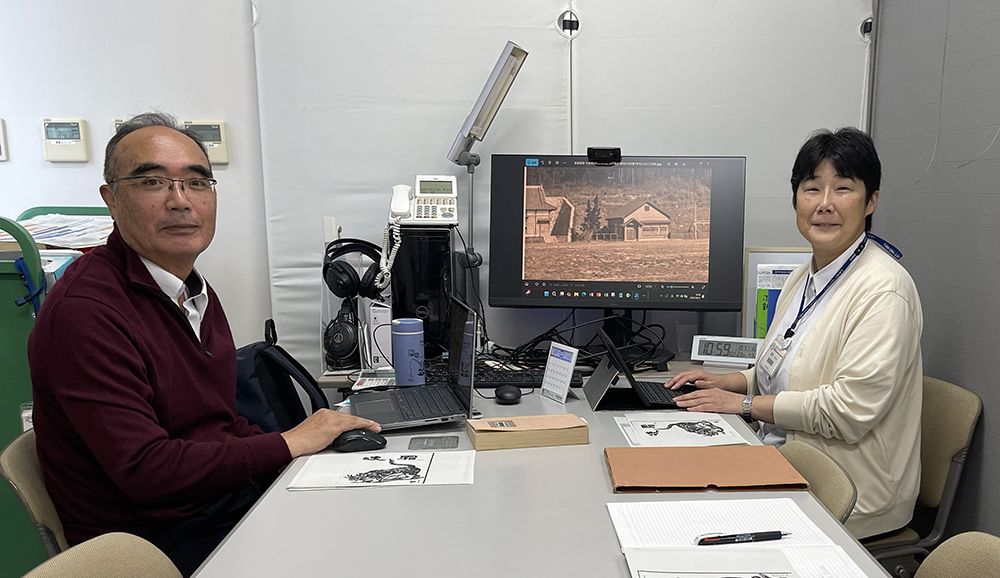 (写真:大学文書史料室の野邑理栄子・室長補佐=右=と、湖内夏夫・事務補佐員)