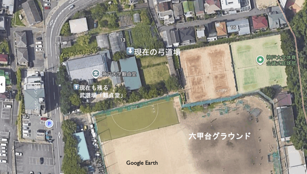 今回の連載を取材・執筆し始めた当初、この「弓道場」はどこにあったのかが不明だった。中央区上筒井通の神戸高等商業時代の校地に残っていた国維寮の周辺なのか? すでに昭和10年に校舎などは六甲台に移転していたので、現在の六甲台の施設だったのか? 後者だとすれば、どこにあったのか。
