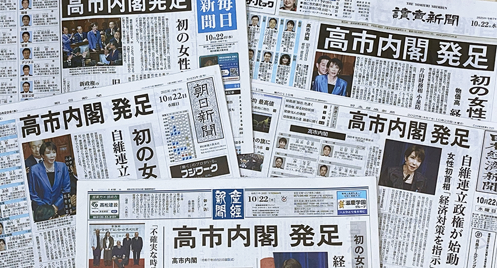 (写真:高市内閣発足を伝える10月22日大阪本社版各紙朝刊の1面)