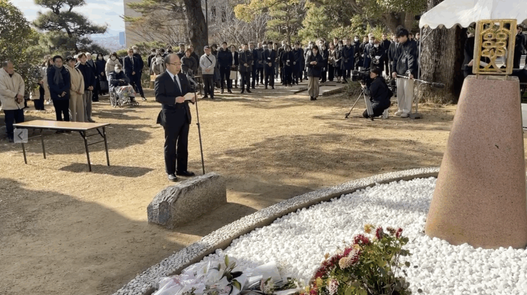 阪神・淡路大震災震災から30年をむかえた1月17日。各地で追悼行事がおこなわれるなか、神戸大六甲台第1キャンパスの慰霊碑では神戸大の震災慰霊献花式が行われた。式典には遺族や犠牲者の友人を中心に約250人(大学発表)が参列。参列者は黙祷と献花を行ない、亡くなった神戸大の学生や職員を偲んだ。