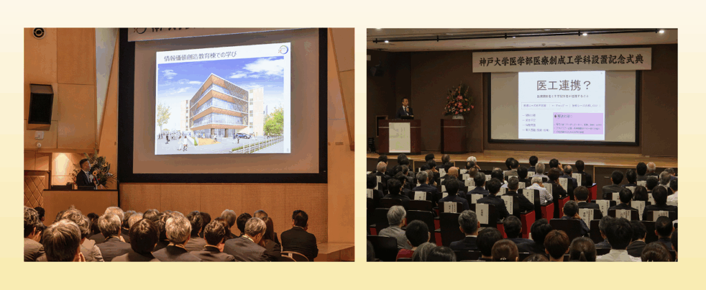 (写真:システム情報学部の設置記念式典 2025年6月27日 百年記念館で/医学部医療創成工学科の設置記念式典 2025年7月1日 神戸大学医学部会館「シスメックスホール」で いずれも神戸大学ウェブサイトから許可を得て転載)