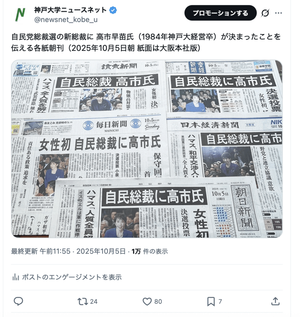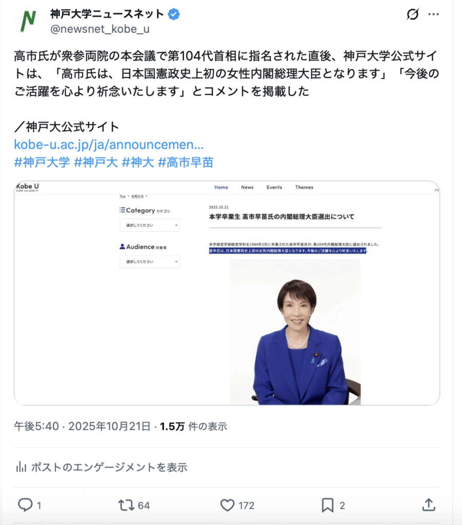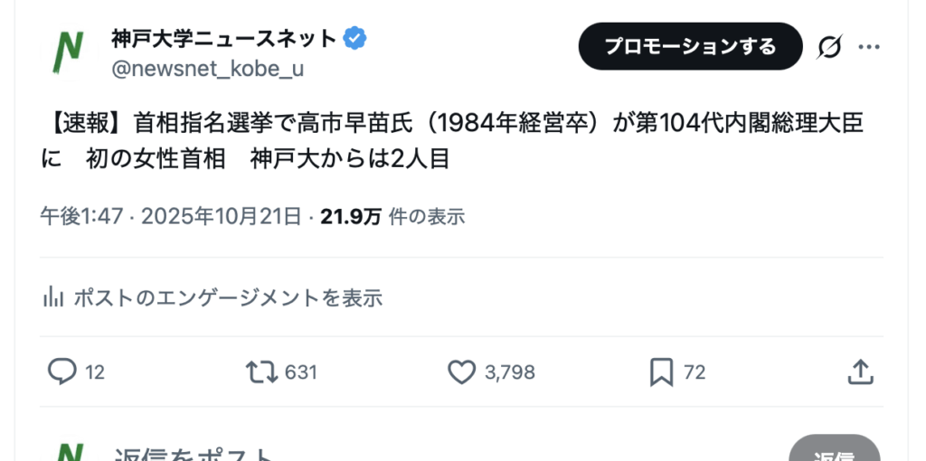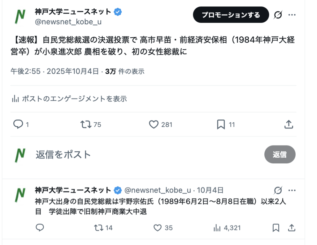 高市早苗氏(1984年経営卒)が、10月21日、総理大臣に選出され、憲政史上初の女性首相となった。神戸大関係者では、1989年の宇野宗佑氏(旧制神戸商業大中退)に次いで2人目。ニュースネットは、テレビ各局の中継をモニターしながら用意していたテキストをポストしたため、ほとんど時差なしの速報だった。こうした動きを伝えたポストは、いずれも大きく表示数が伸びた。