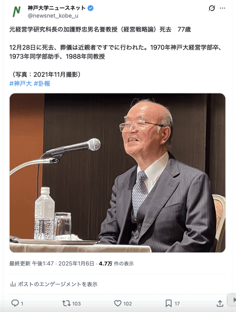 学内筋から得た情報で、地元紙より1日早く伝えたニュースネットの独自ネタだった。教え子や薫陶を受けた研究者、ビジネスマンからの引用リポストが多く、「加護野先生がおられたことが、数多ある大学の中で神戸大学を選んだ、1つの大きな理由でした」「鋭い洞察と見事なジョークが一体となったお話をもう聴けないのは残念です」などといった声が100を超えた。ポストには、2021年に行われた『経営学の開拓者たち』出版記念シンポジウムの壇上で微笑む加護野さんの写真が添えられた。