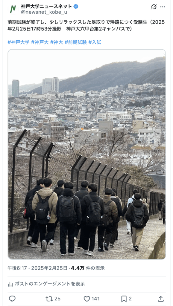 前期入試が終了し、夕暮れの六甲台第2キャンパスの坂を降りる受験生の後ろ姿を捉えた写真ポスト。遠くに新神戸の高層ビルが見える。「阪急六甲から続く神大坂(のラスボス部分)だ 格が違う勾配を誇り、多くの神大生の足腰を鍛えた坂…」「現役の時試験終わってちょうど坂下ってる時に親から電話きて”どうだった”って聞かれて適当に”採点次第やなぁ笑”とか言ったんだけど、普通に数学0完だったし、物理1枚白紙、化学2枚白紙で本当に泣きそうやったの思い出した」など、思い出す情景もさまざま。