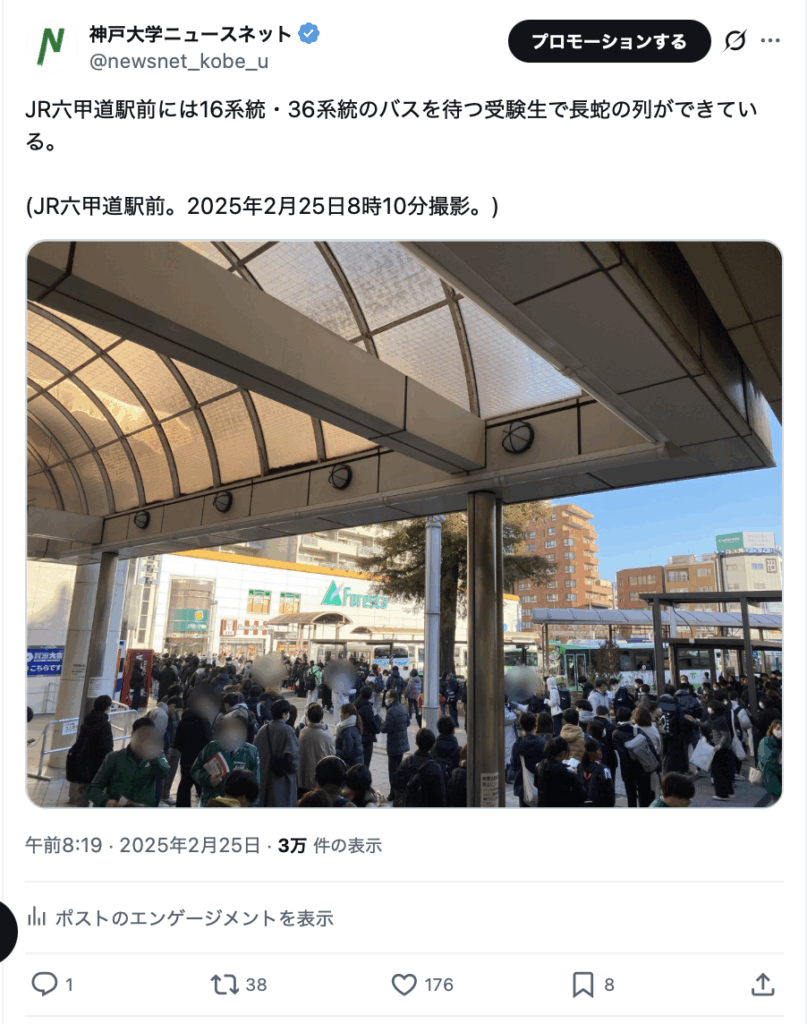 ▼10位「JR六甲道駅前には16系統・36系統のバスを待つ受験生で長蛇の列ができている」(2月25日 8:19)