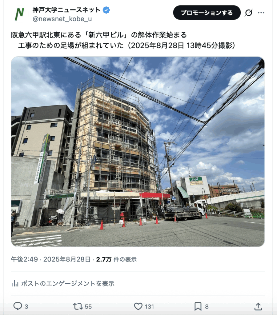 この日、工事のための足場が組まれていた「新六甲ビル」の写真をポスト。このビルには、上階に中国料理の『六甲苑』(1966年開店、2023年閉店)が、1階には『ケーニヒスクローネ』阪急六甲店(1978年開店、2023年閉店)があった。12月には、更地になっている。