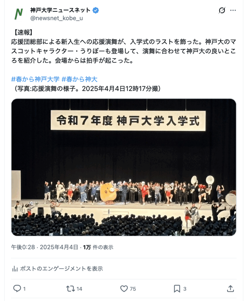 ▽【速報】 応援団の新入生への応援演舞が入学式のラストを飾った(4月4日12:28 1.1万回)