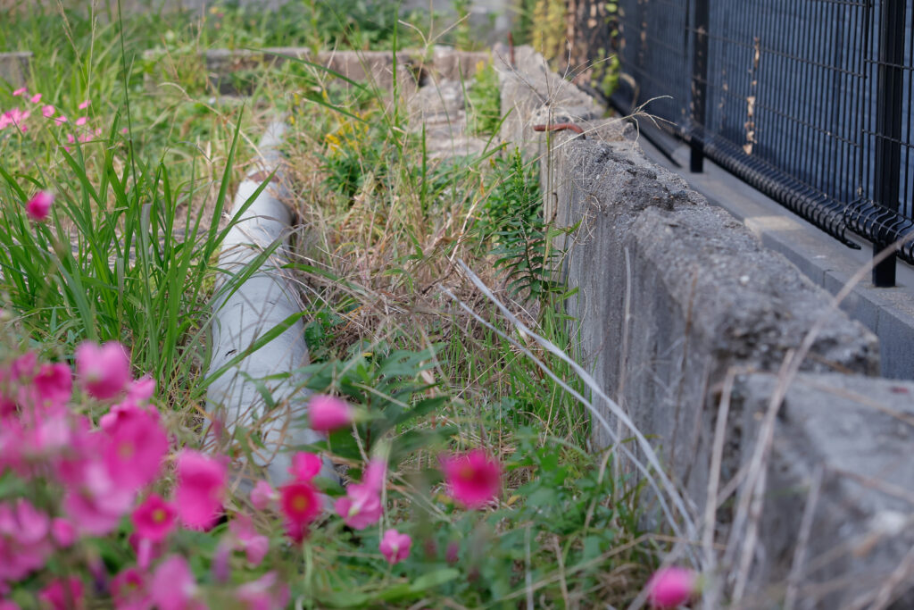 現在、アスファルトやコンクリートで覆われる都市部だが、ここは六甲山系の白っぽい土に雑草が根付いている。ところどころに、むき出しのコンクリート、風化した金属製のパイプが地面から突き出ている。