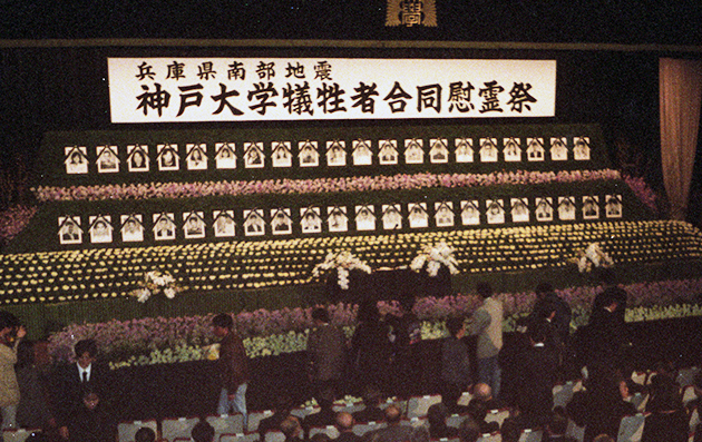 六甲台講堂のステージには、亡くなった神戸大の学生39人と教職員2人の遺影が並んだ。