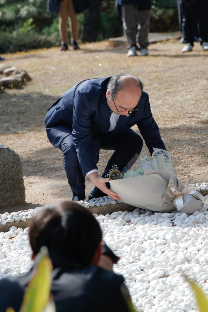 式典開始時時刻の12時半になると、全員が慰霊碑を囲んで1分間の黙祷を捧げた。黙祷後には、大学を代表して藤澤正人学長が花束を慰霊碑に献花し、続けて大学幹部も白い菊の花を供えた。その後、参列した遺族らが献花した。献花者の中には経済・経営・法学部の学部長らの姿もあった。