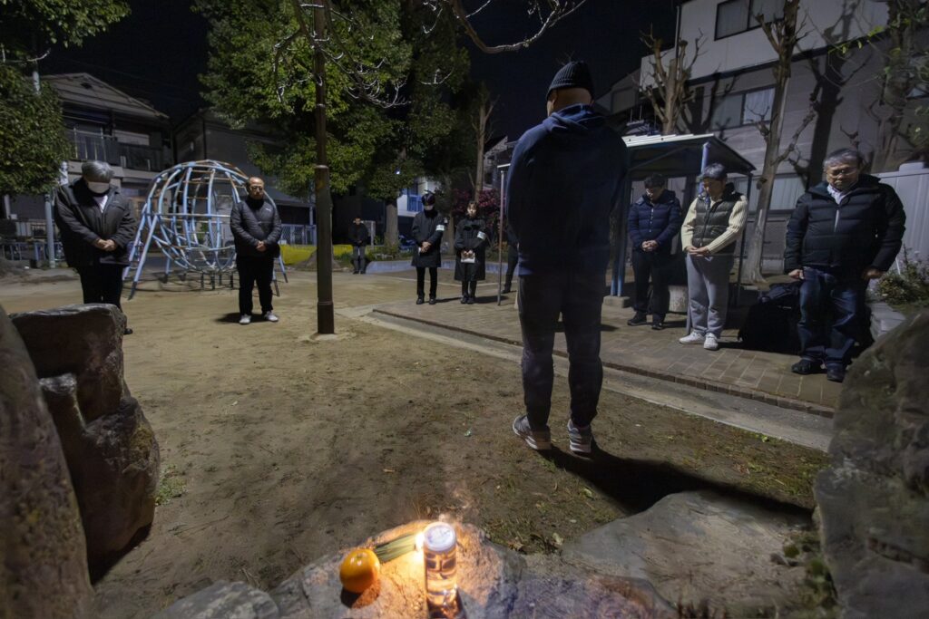 5時半ごろからともだ公園に関係者が集まりだすと、公園の一角にみかんや酒などを供え、ろうそくに火を灯した。訪れた人が順番に線香をあげ、手を合わせた。
