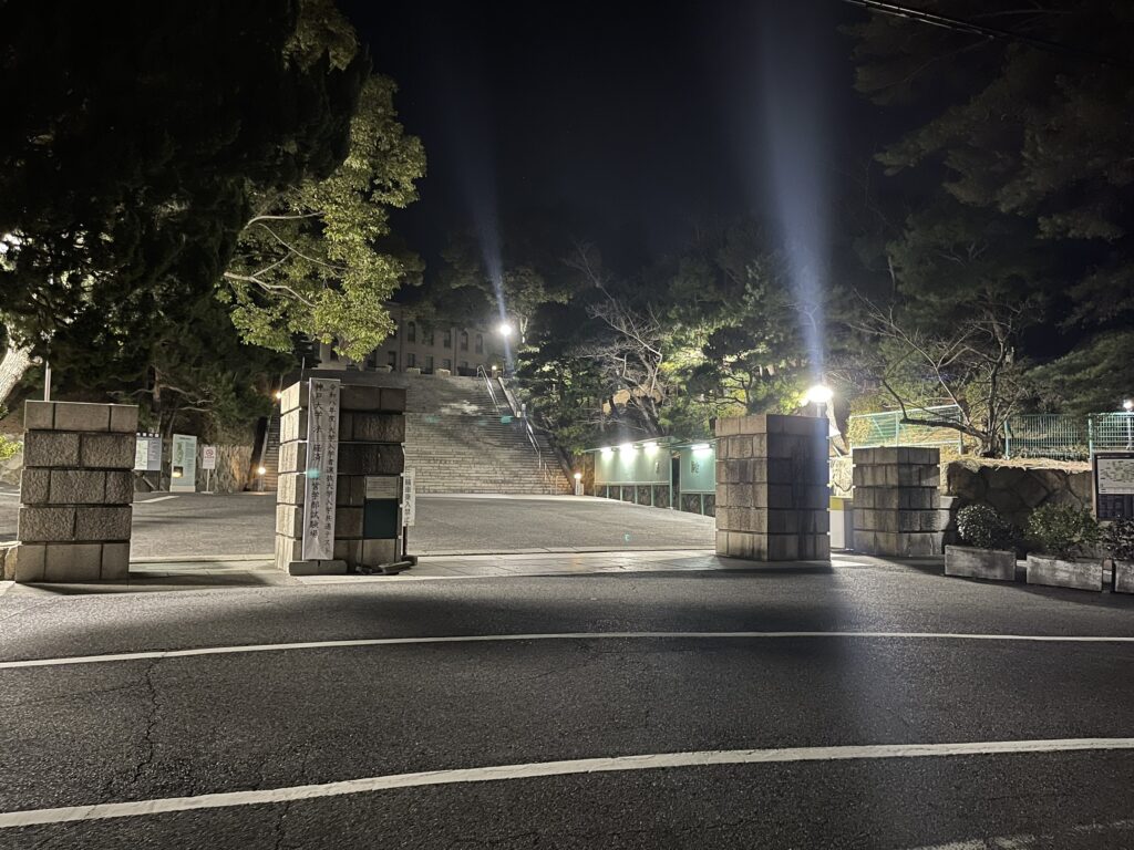 この時期らしい寒さだった神大正門前。辺りは静かで、慰霊碑を訪れる人はいなかった。正門前からは、普段と変わらない夜明け前の神戸の街の明かりを一望することができた。