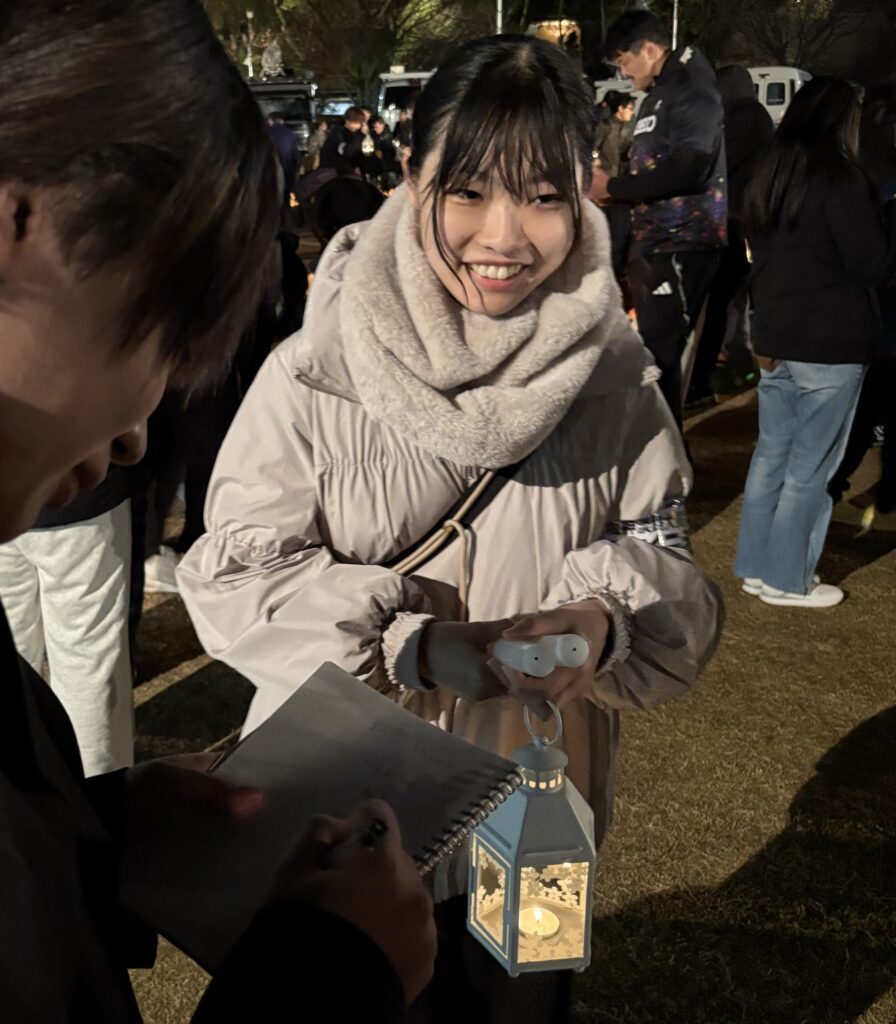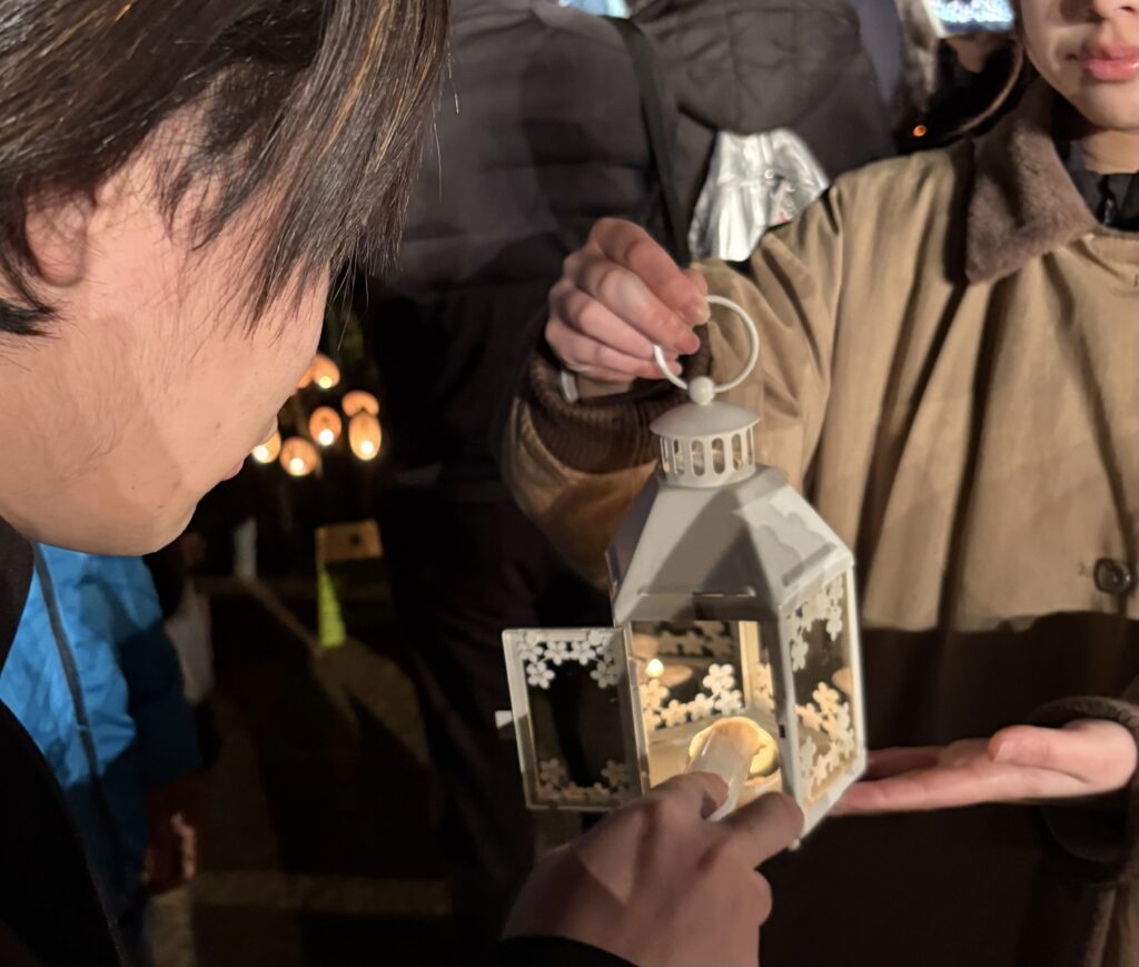 (写真:1.17リーダーズの学生が運ぶランタンから、参加者がろうそくに火を灯した。2026年1月17日5時21分頃撮影)