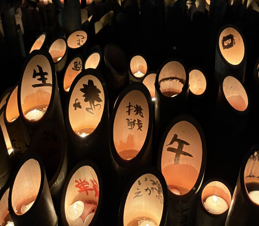午前5時過ぎ、メッセージが描かれた竹灯篭や紙灯篭にポツポツと火が灯り始めた。有志学生団体「1.17リーダーズ」からろうそくを受け取った参列者達は、竹燈籠に順に火をつけていく。描かれた「命」や「平和」。参加者は、発災時刻の午前5時46分を待っている。