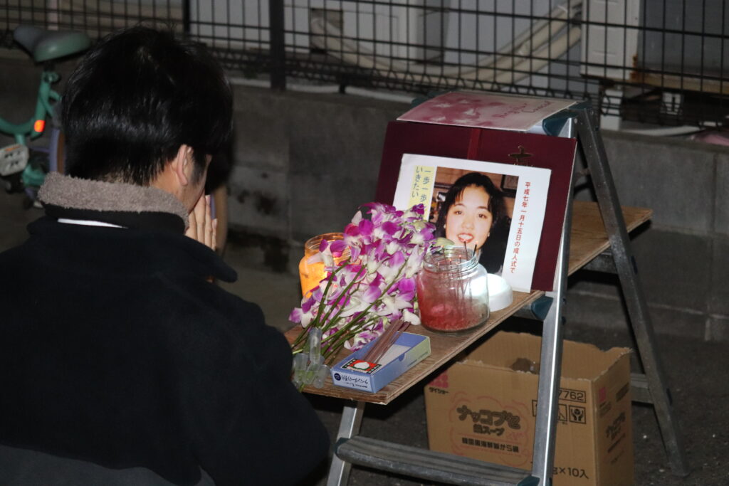今年もこの日この時刻に「ニュー六甲ビラ」の跡地に集まった政志さん一同は、志乃さんの写真が置かれた献花台を前に、5時46分に一斉に1分間の黙祷を捧げた。