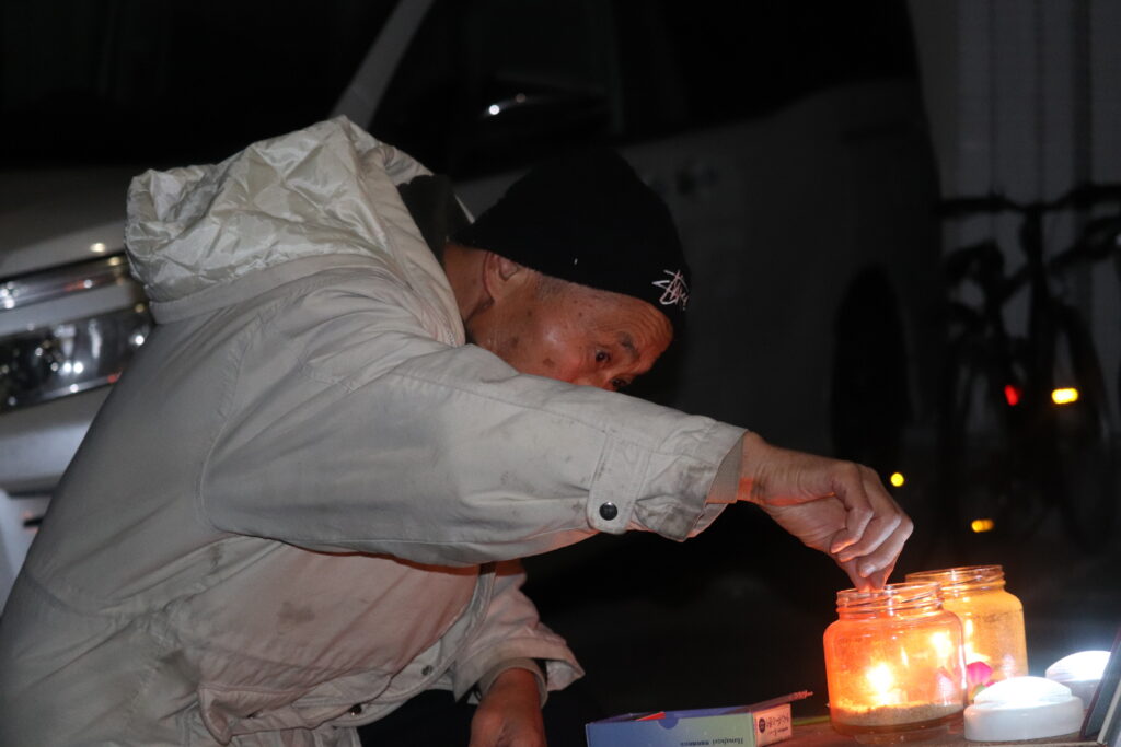 (写真:現場で組み立てた献花台に火を灯す上野政志さん。2026年1月17日5時40分ごろ撮影)