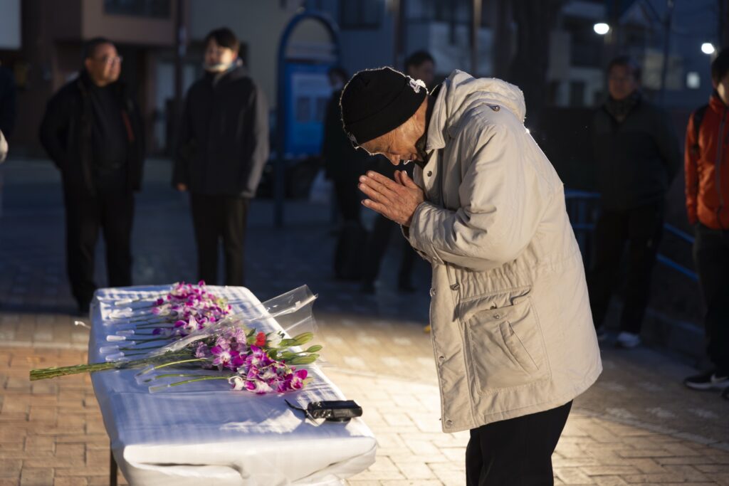 (写真:琵琶町公園の献花台前で手を合わせる政志さん 2026年1月17日6時42分撮影)