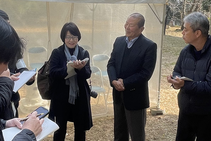 (写真:取材の記者に囲まれる坂本さん2026年1月16日 12時08分六甲台第1キャンパスで)