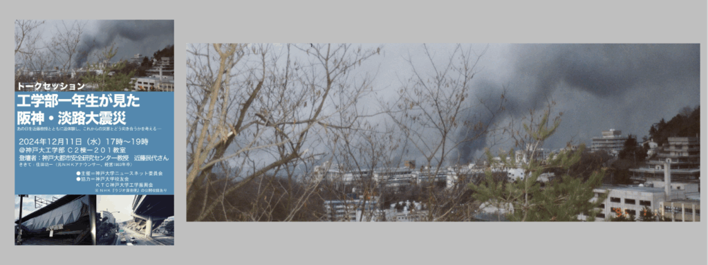 ききて)まずは、今皆さんの前にあるポスターの写真なんですけれども、この写真は鶴甲から撮影された写真です。ちょうど煙が見えますけれども、手前が工学部の建物です。ちょうど私たちのいるこの建物。その向こう側の街の中から煙が立ち上っているという、そういう写真。これはたまたま市民の方が撮った写真なんですね。