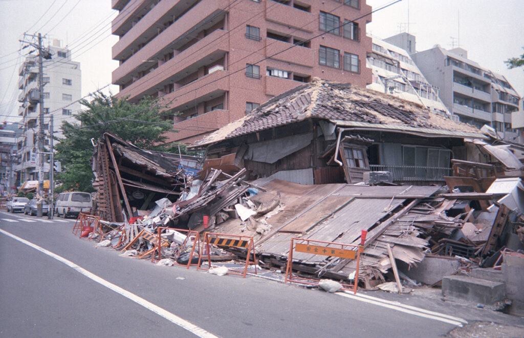 (写真:倒壊した住宅 1995年8月灘区備後町で撮影)