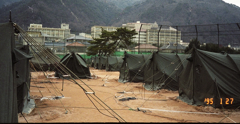 (写真:自衛隊の前線基地になった神戸大学六甲台グラウンド 1995年1月27日 ニュースネット撮影)